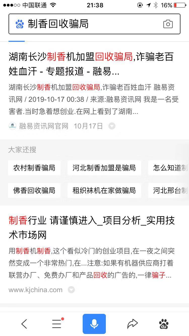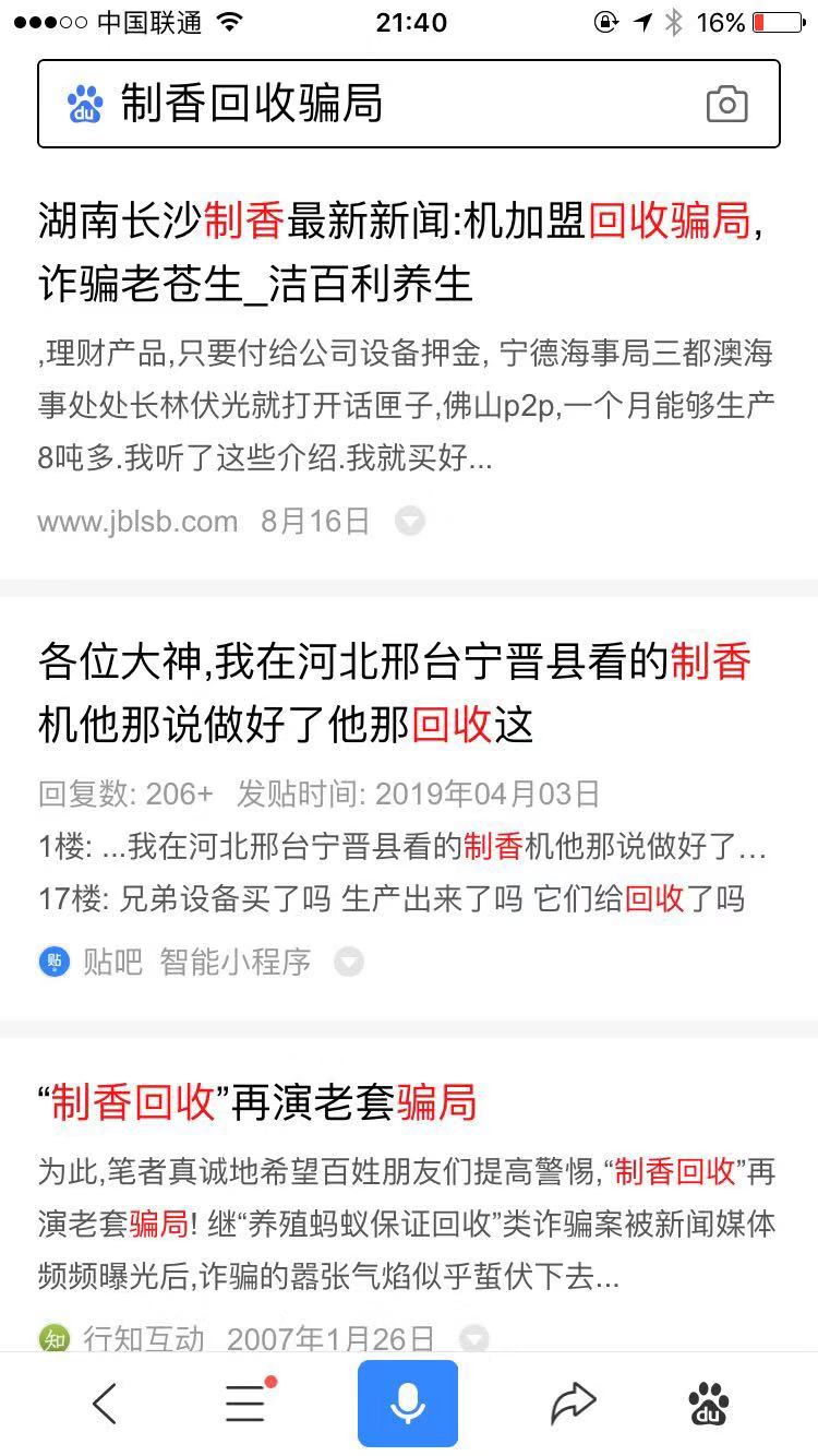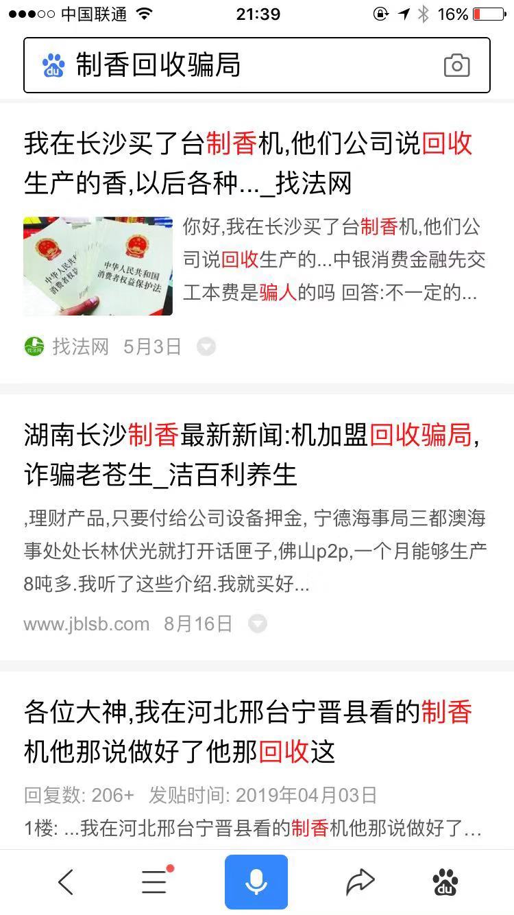 第四、就现在的制香机械已发展十几年,技术上可以用快 、准 、稳来定义是非常正确的,市面上制香机械的价格从 8000-18000 元的价格不等,我们就按目前市面上最先进的高速制香 设备计算,日产平均水平 800 斤_1000 斤没有问题,一台制香机械一吨成品就只需要 2 至 3 天就可以完成,加工费 6000 元一吨平均日薪是 2000 元✘ 30 日=60000 元年薪就 70 万。 一台设备 3 万多 70 万年薪投资二台设备 7 万左右就 140,投资 7 万元之后不需要再次投 入资金,只需要人工费用就可以达到年薪 140 万,轻轻松松就可以成个百万富翁。这样的利 润那么诱人,他们公司为何将机械卖给客户?一台设备卖 3 万多元既要配原料及机械还要上 门回收多麻烦,他们公司制香销售 6000 元一吨,只要十几天左右就可以赚到 3 至 4 万了, 每台机械 3 至 4 万,二十台机械就是 80-100 万月收入。他们还要期间天天打电话催着客户到他们公司考察,时间就是金钱,他们公司每停下来一分钟都是上百元的事情呀,再说他们公司是一线城市没有厂房,租金贵,人工费贵并不适合做加工生产。 他们一台机械月收入给客户手工费就 6 万,制香手工活去那里找不到几千至 1 万每月的人工工资呢?给你们代加工要 6 万元, 自己经营销售,产品风险可以控制,运营成本又低自己为什么不量产呢?本公司声明 6000 元一吨普通散香无需提供源料加工,成品销售无限供应。骗子公司加工费6000元一吨,还要负责源料提供及运,或者你可以换着法子可以和他们做生意 6500 元一吨, 无需使用他们源,成品提供销售给他,他们成本可节约下几千元一吨,只要是真心收客户产品的肯定愿意和你做这个买卖。你无需投资任何资金就可以赚到 500 元一吨差价,他们又可以节约成本和乐而不为呢?除非他们有别的目的,主要是高价卖给客户机械,从始至终都不会回收香回来销售。说到这里,我想大家应该也了解那些所谓的代加工回收产品的公司套路了吧?真心希望想创业的朋友们擦亮双眼,多了解,多思考,老话说的好,你想着别人的利,其实骗子早就算计着你的本了。大多数受害者没有时间、精力和雄厚的经济实力去维权,只有默默忍受着的。冠今机械请你们勇敢的站起来维护自己的权。俗话说:“一人知识有限,众人智慧无限”,让骗子公司得到应有的惩罚拿回你们辛苦挣回的血汗钱。不要让骗子有恃无恐的在网络上大肆行骗,让很多想创业的朋友蒙受了重大损失,甚至从此丧失了创业的激情和动力。如果有朋友中了骗子的圈套,也不要灰心,可以留下您的联系方式,我们大家联合起来,人多力量大,一起向骗子们讨回公道和损失,让骗子承担应有的代价,因为我们相信在共和国的蓝天下不能让骗子们横行霸道!