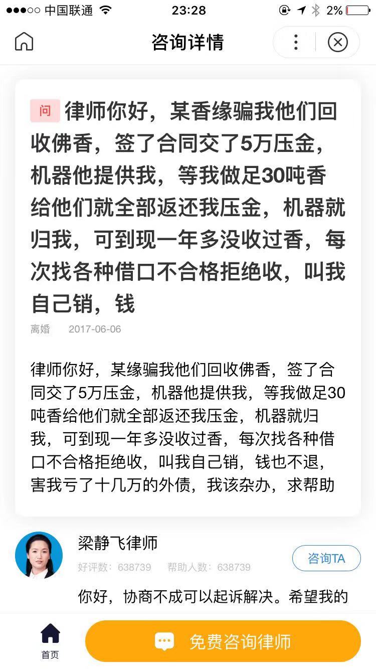 四、合同要求生产出产品需先寄一斤样板回公司,产品合格了在上门会回收。在签约时,合同上肯定有一条就是要求产品一定要合格达标才能回收。但是你生产的产品永远都是不合格的,理由一大堆:香的颜色不合格,香不结实,香表面粗糙,香脚不平,香签大小不一样等等。目前我们国家没有明文规定佛香的合格标准,所以你制作出来的产品合不合格都是这些骗子公司说了算。他们都是在钻法律的漏洞,一般的客户没时间和精力去维权,骗子们尝到了甜头,所以现在的骗子公司越来越多。